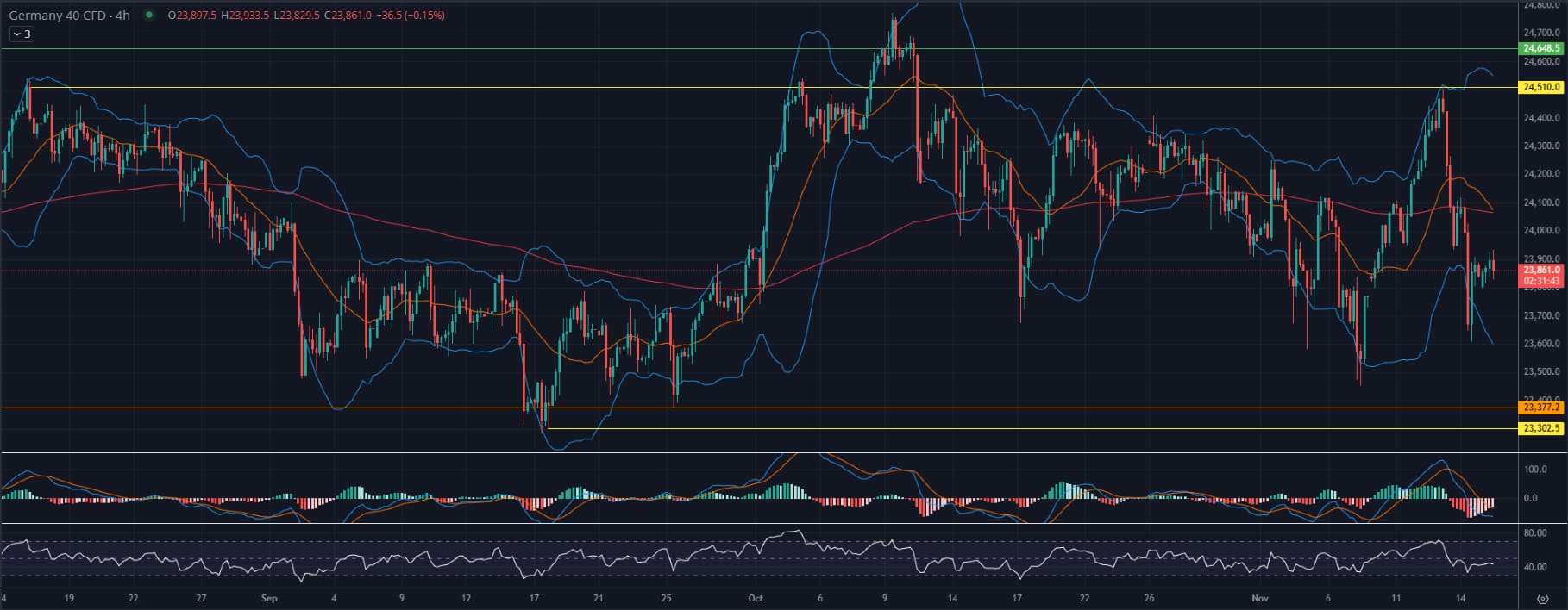 The Germany 40 CFD (4H) remains under pressure after repeated rejections at 24,510 resistance. Price action has turned choppy around 23,850, with both the 50 EMA and 200 EMA converging overhead near 24,000–24,100, forming a resistance cluster. The RSI (around 40) shows weak momentum, while the MACD is still below the signal line, suggesting bearish bias persists despite slight short-term stabilization.