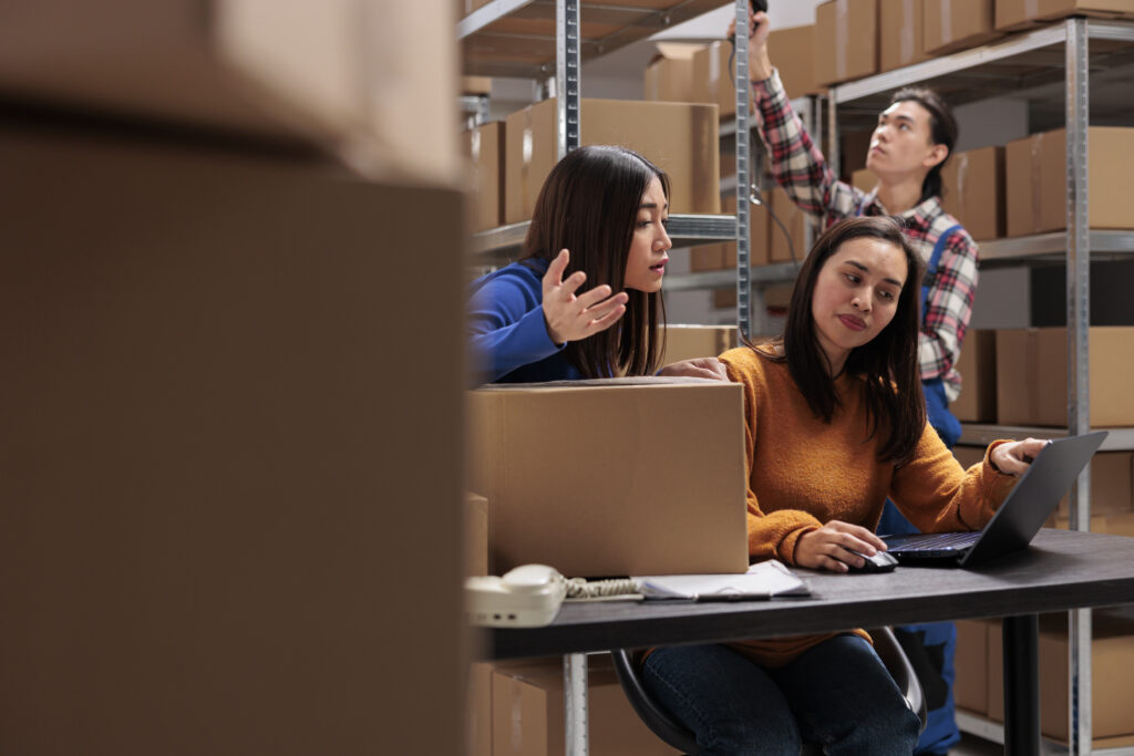 Storehouse employees checking customer delivery satisfaction on laptop and arguing about negative feedback. Postal service asian women coworkers managing shipment from warehouse computer